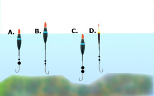 D. Spławik wyważony prawidłowo – posiada cienką antenkę dzięki temu jest bardziej czuły na brania niż przykłady A,B,C. Można by do niego jeszcze przyczepić drobną śrucinę np. 0,3 grama tak żeby się zatopił o kilka milimetrów więcej, wtedy będziemy wiedzieć nie tylko brania przynęty ale żerowanie ryby przy przynęcie próbowanie jej (ryba dotyka